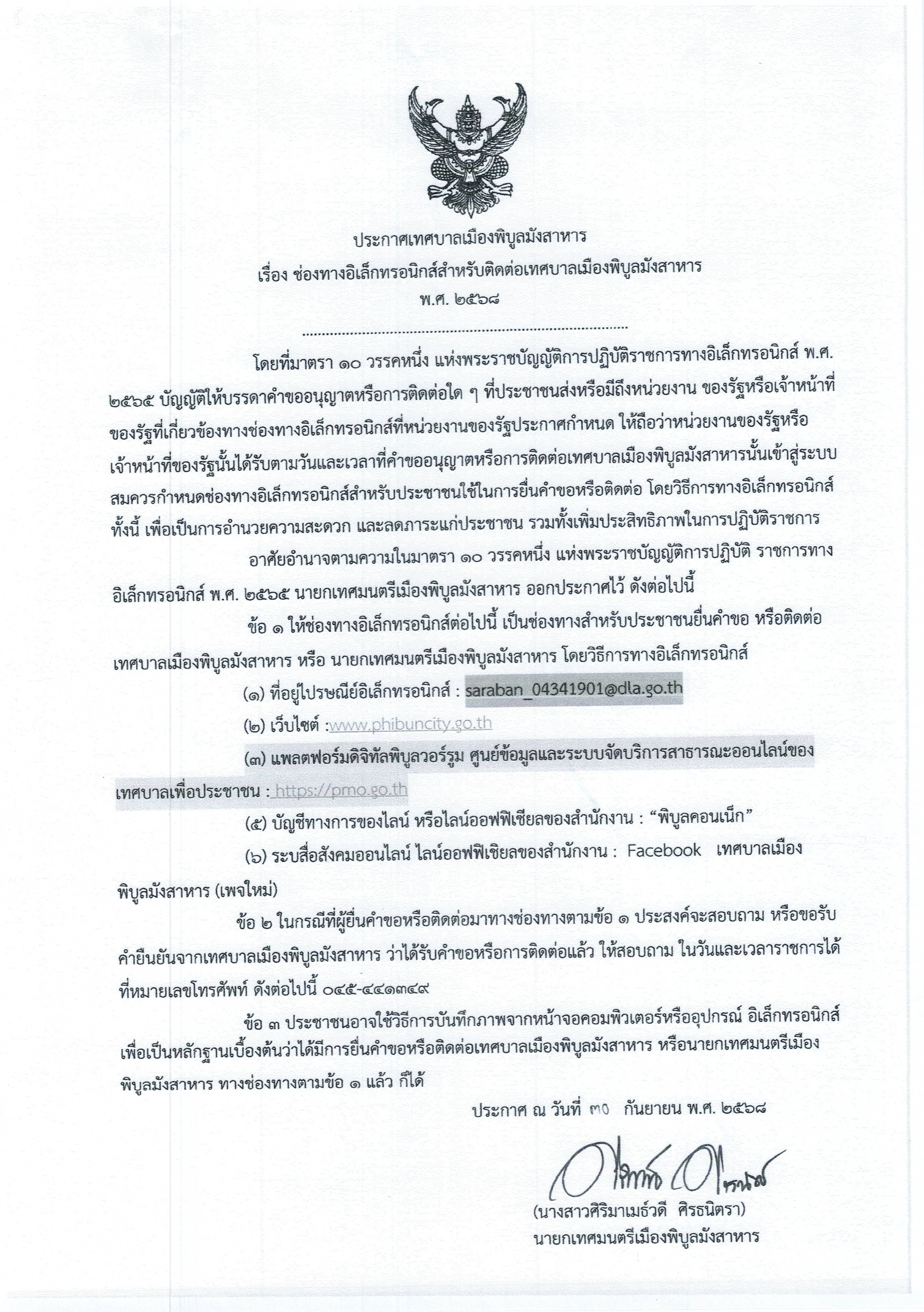 ช่องทางอิเล็คทรอนิกส์สำหรับติดต่อเทศบาลเมืองพิบูลมังสาหาร